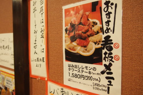 「レトロ居酒屋219」看板メニューでもある”はみ出しレモンのタワーステーキ”。