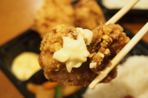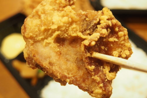 国産鶏の胸肉とモモ肉が2個ずつ入ったMIX唐揚げ弁当は、それぞれの食感の違いも楽しめる1品。