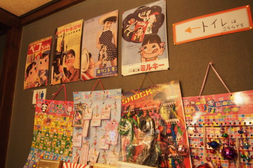 店内には昭和を連想させるBGMやポスターが貼ってある他、普段は駄菓子も並んでいます。