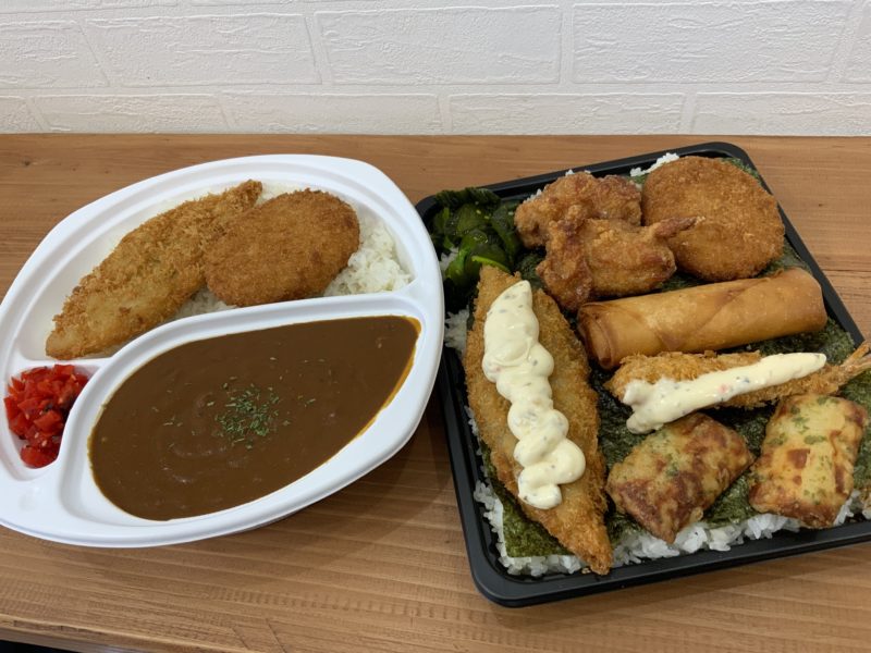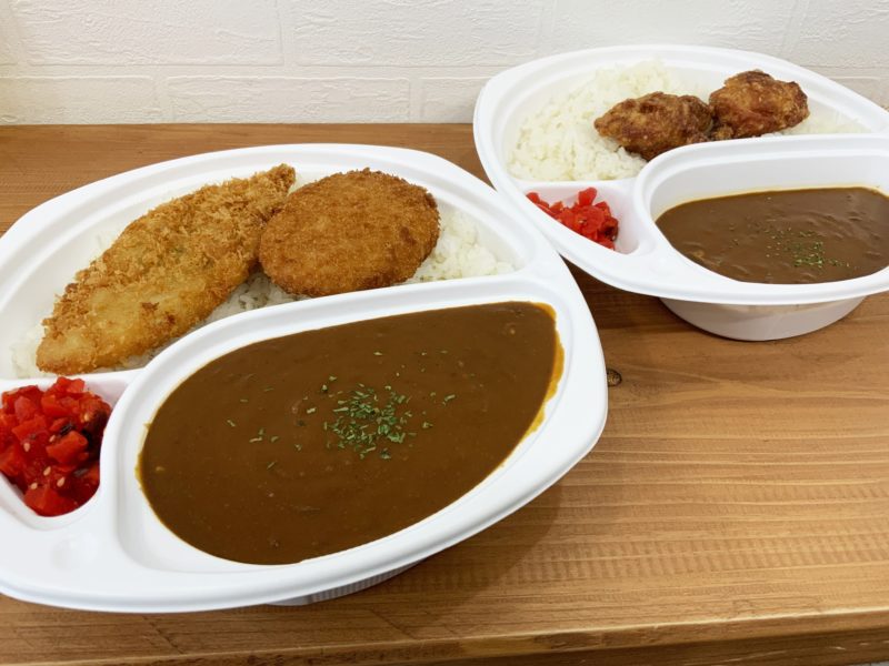 1キロカレーは、ご飯2合にたっぷりのルー。揚げ物が2種ついています。奥は500円の唐揚げカレーなんですけど、ご飯とルーが1キロカレーの半分の量です。それでも一般的なお弁当よりボリューミーなんですけど。
