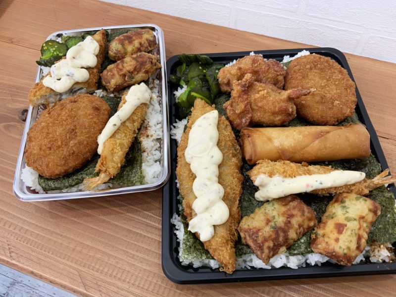 次は「1キロのり弁」。隅から隅までみっちり詰まったご飯の上におかかと海苔が敷かれ、所狭しと揚げ物がのっています。