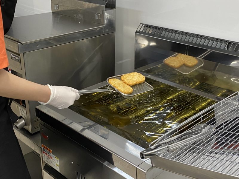 おにぎりを握ったあとおもむろにハッシュドポテトを揚げだす福田さん。