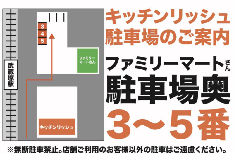 駐車場は、お店の前に2台止められるほか、お隣のファミリーマートの駐車場の奥、3~5番を使えるようにお願いしてあるそうなので、そちらまで!