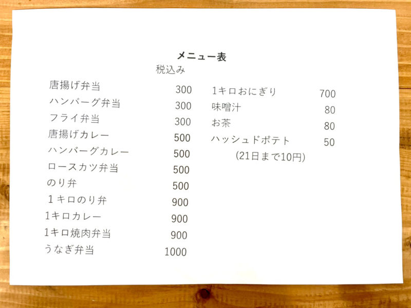 やはり1番目を引くのは総重量1kg超えで900円と謎コスパの「1キロのり弁」と「1キロカレー」ですが、他にも300円とお手頃なお弁当や500円でボリュームもあるお弁当がたくさんあります。