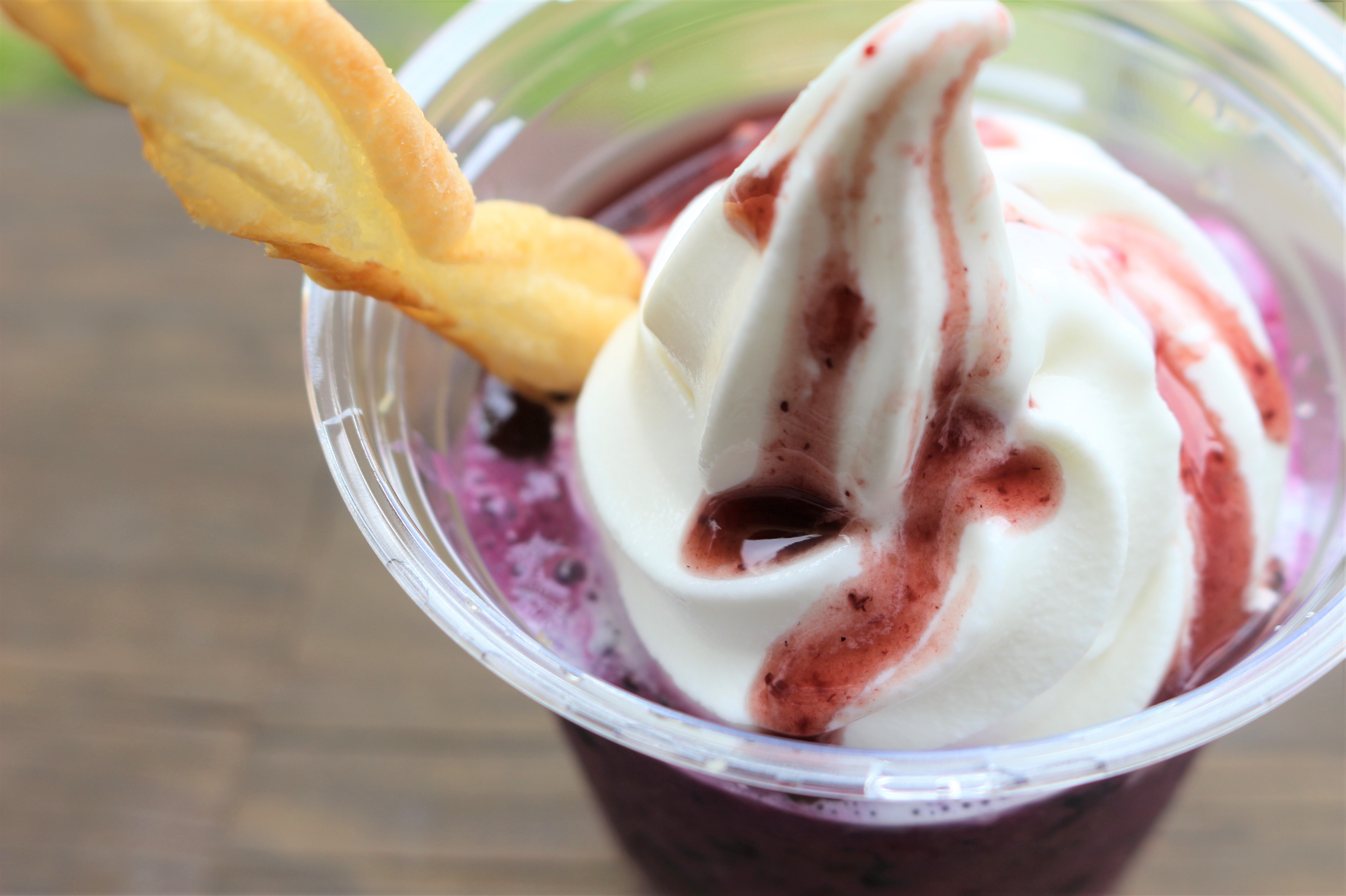 ブランド牛乳「夢みるく」が使われているソフトクリームにブルーベリーソースがたっぷり。ブルーベリーがふんだんに使われた甘酸っぱいシャーベットとザクザクのグラノーラ、食べ応えがあります。