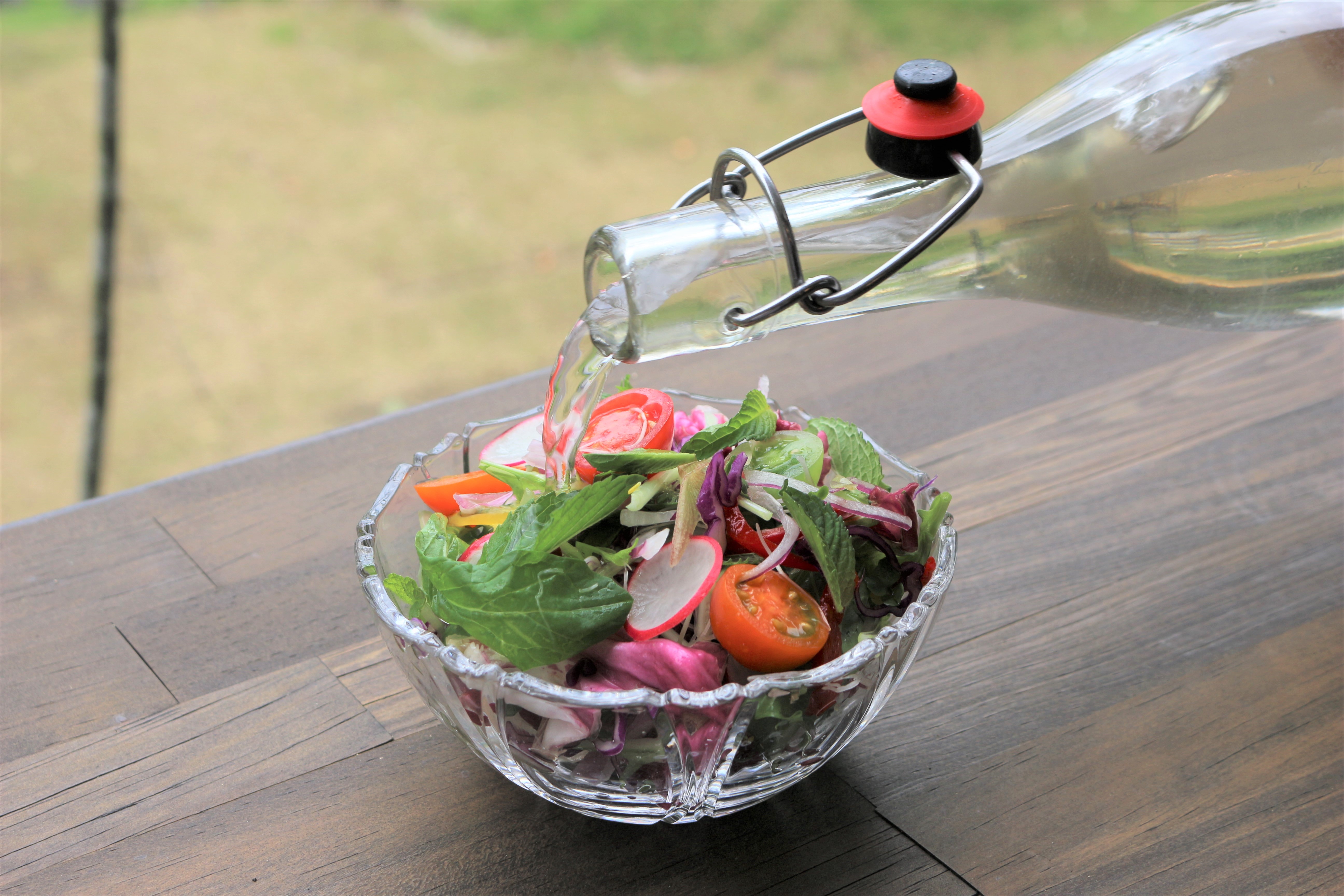 彩り鮮やかなサラダに“水ドレッシング”とオリーブオイルをドバドバとかけていきます。
