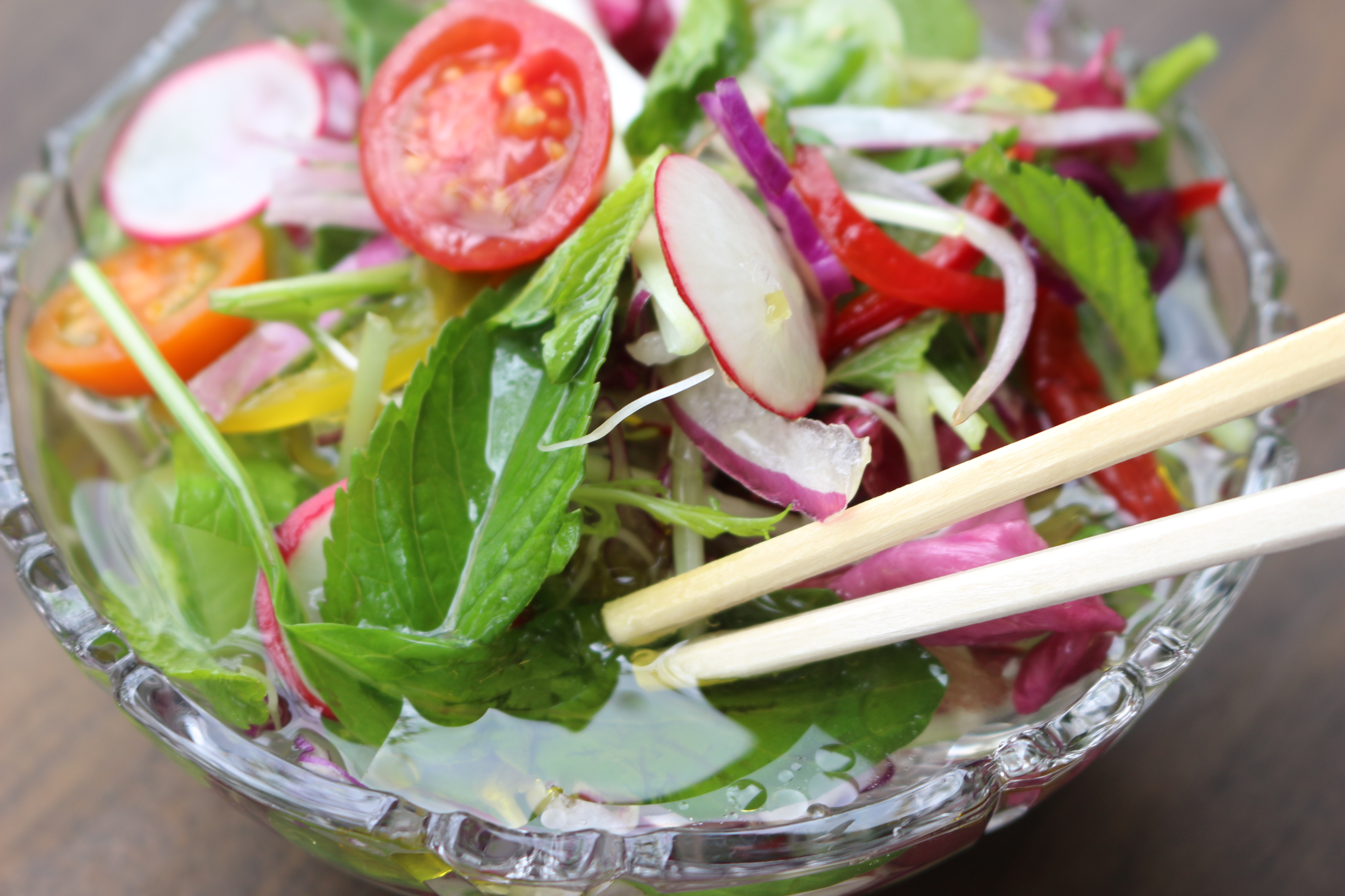 野菜を浸して食べるそうです。ドレッシングもジャブジャブと飲めてとっても新鮮なサラダでした。病みつきになるかも!?