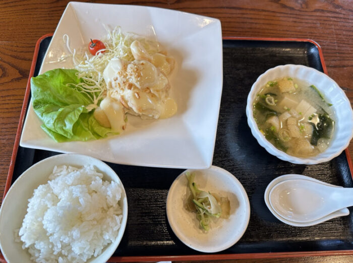 本日のメインから2品、汁物、小鉢、白米、香物、デザート、飲み物の8品。