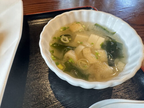 この日のスープは味噌スープ。器が中華風なのでいつもの味噌汁とは違う感じで楽しめます。
