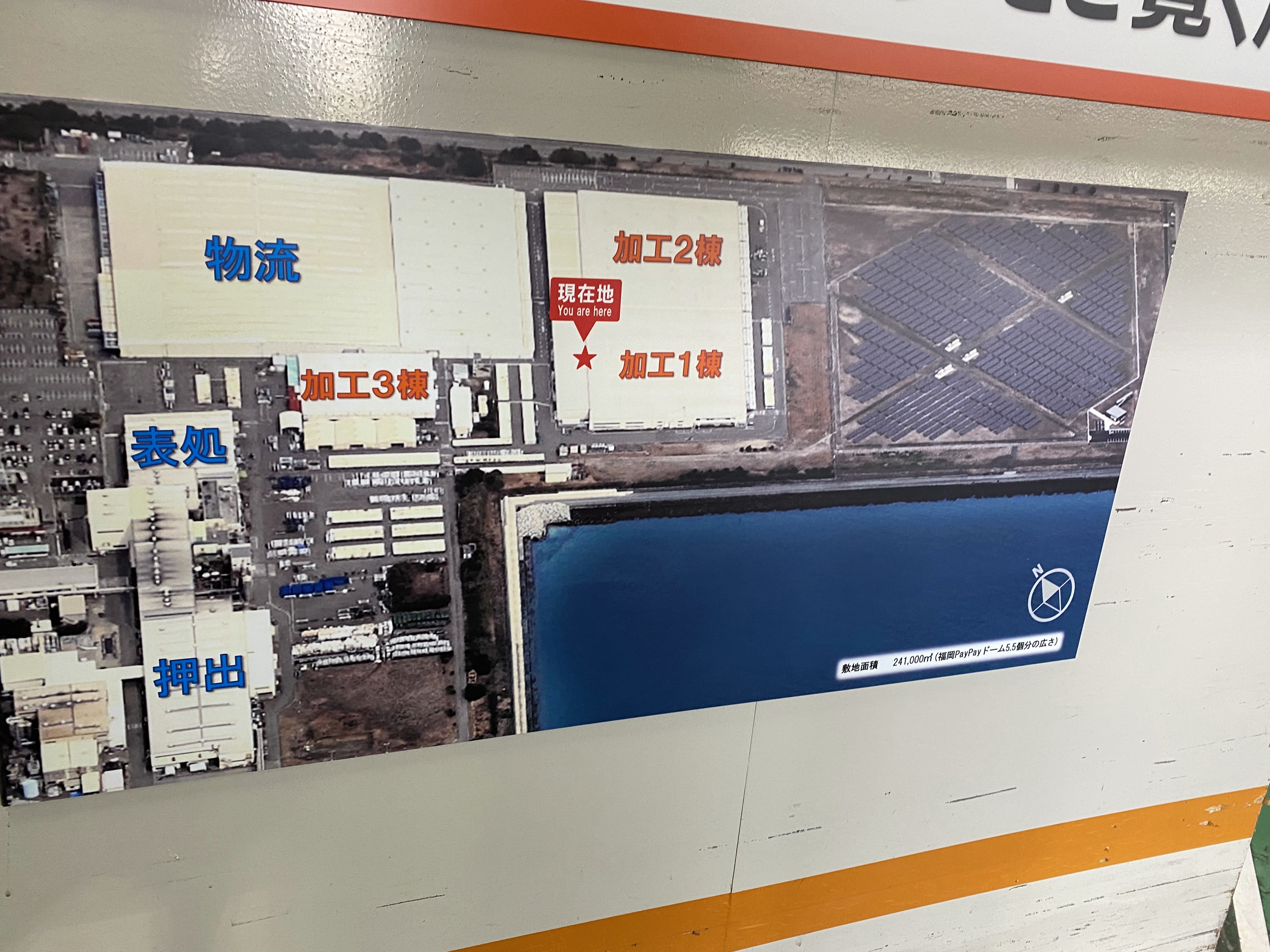 この有明工場内ではアルミサッシの製造(加工、押出、表面)物流作業を行っているのだそう。