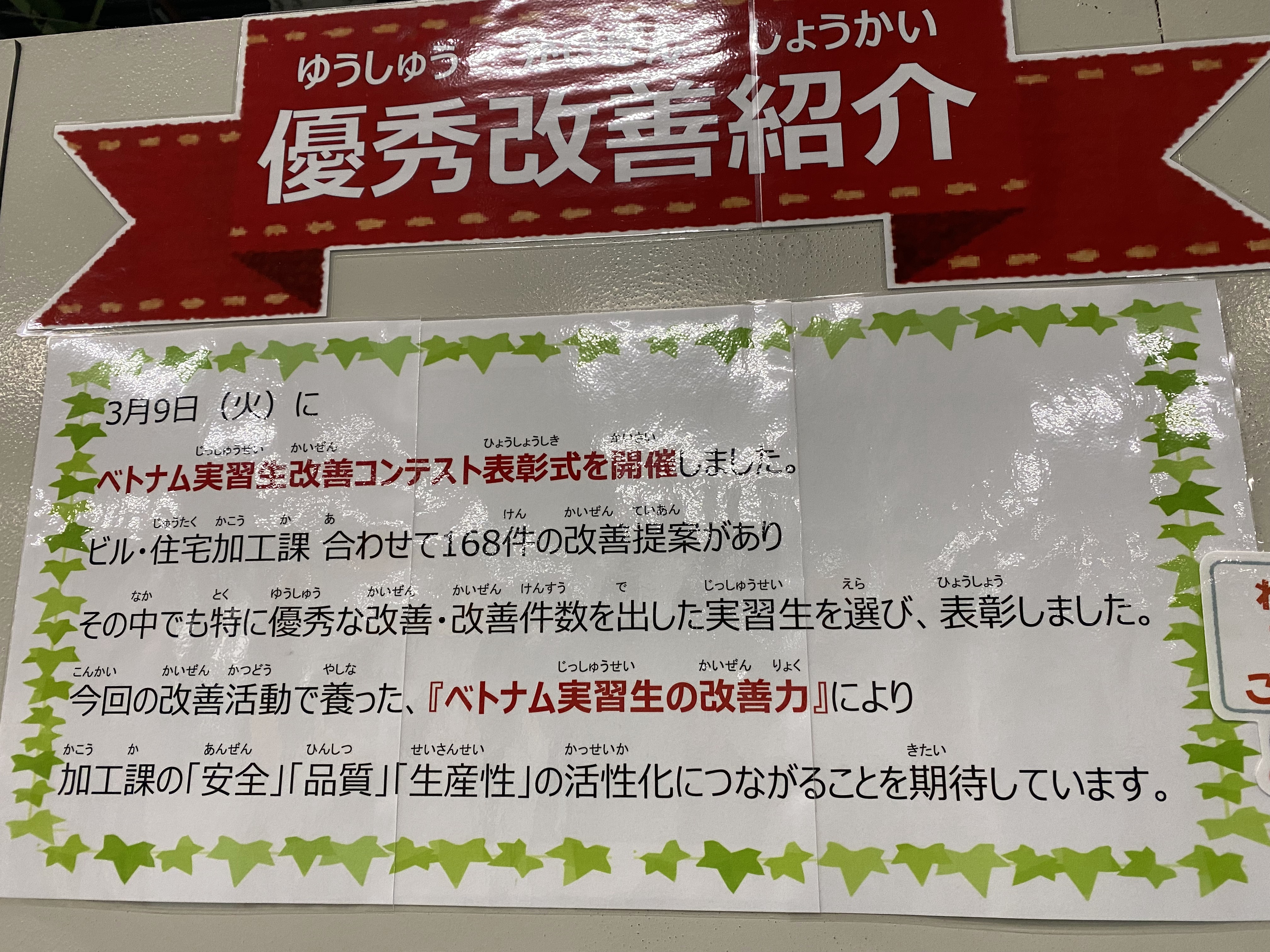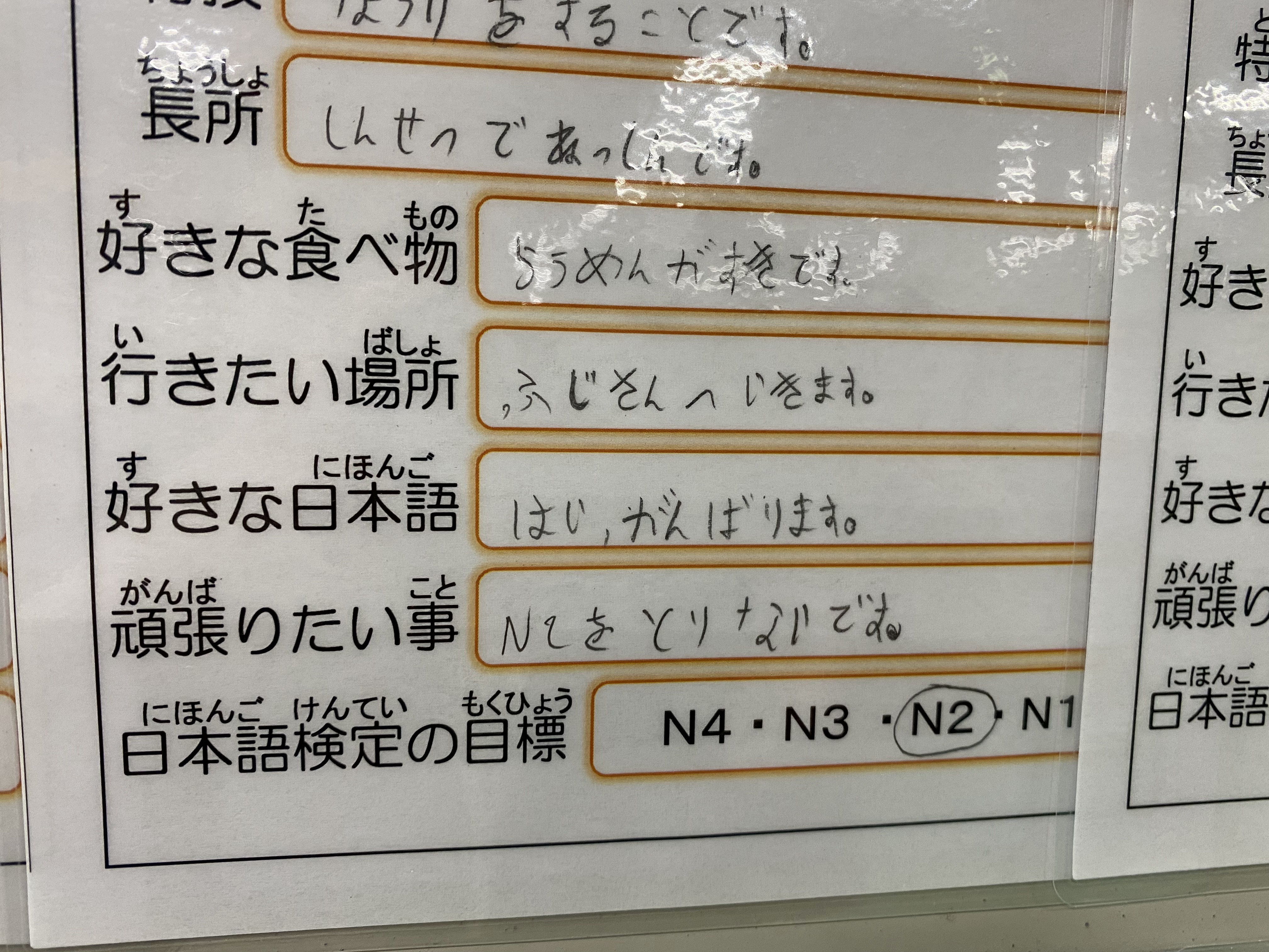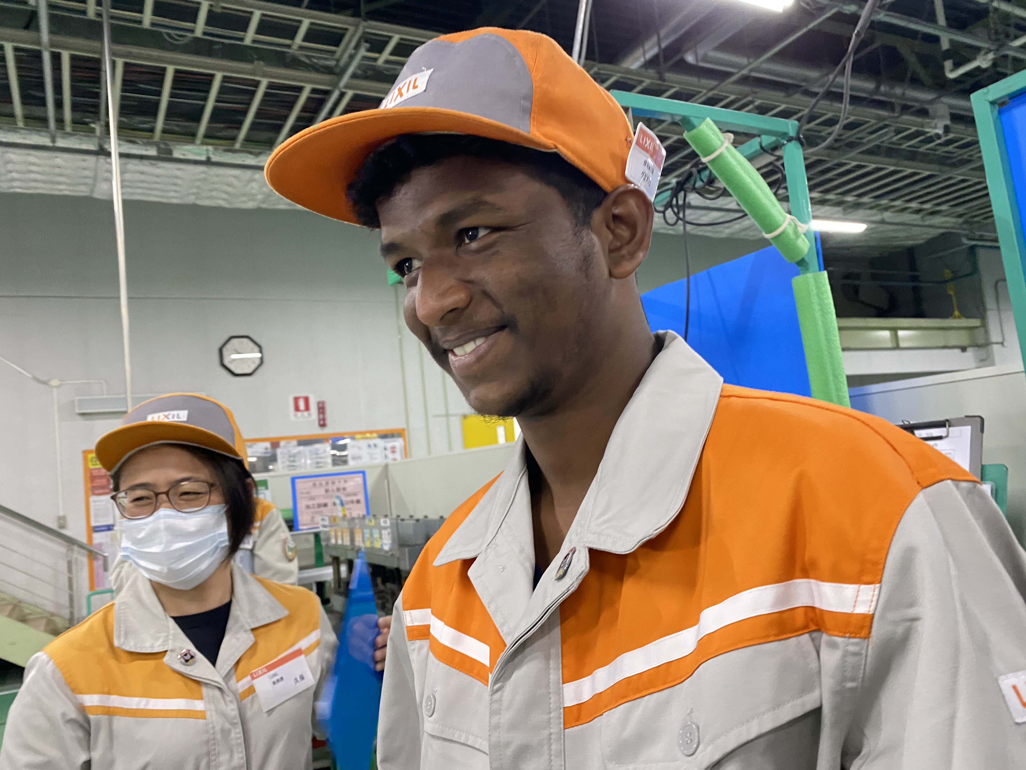 「ミンナ ヤサシイ。ギノウジッシュウセイ ノ サポート 充実シテマス。休憩時間ハ日本人ト一緒。タクサン話シテ日本語覚エタイデス。アニメ スキ」