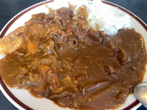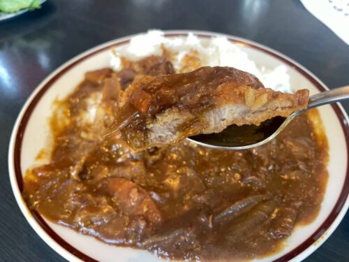 カツが見えないほどたっぷりとカレーがかけられていますが、お皿の左端にしっかりカツも鎮座していて、ボリューム満点!