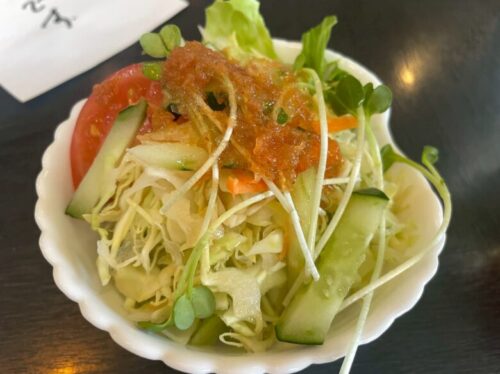 さらに、手作りのお味噌汁と、山盛りのサラダ、さらに自家製白菜漬けまでついてくるなんて…!