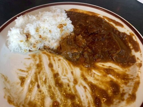 3分の2ぐらい食べても、まだ普通のカレー1食分ぐらいはありそうな量で、大盛りと言わず、3人前ぐらいあるのではないかと思うほど、大盤振る舞いのボリュームで、ありがたい限りです。ペロリと完食させていただきました!