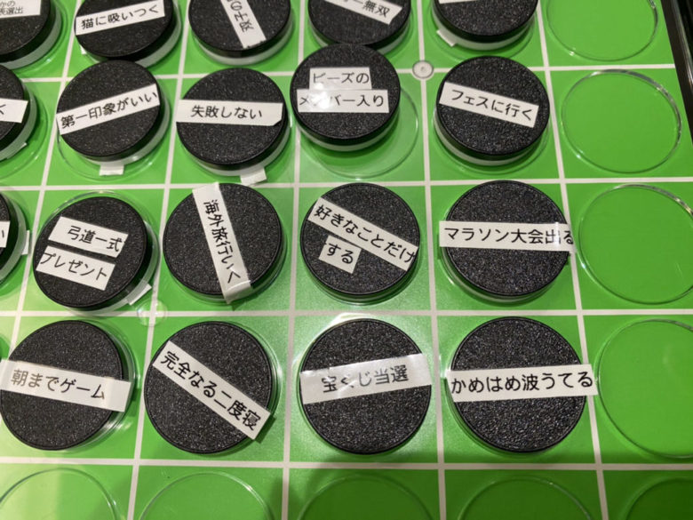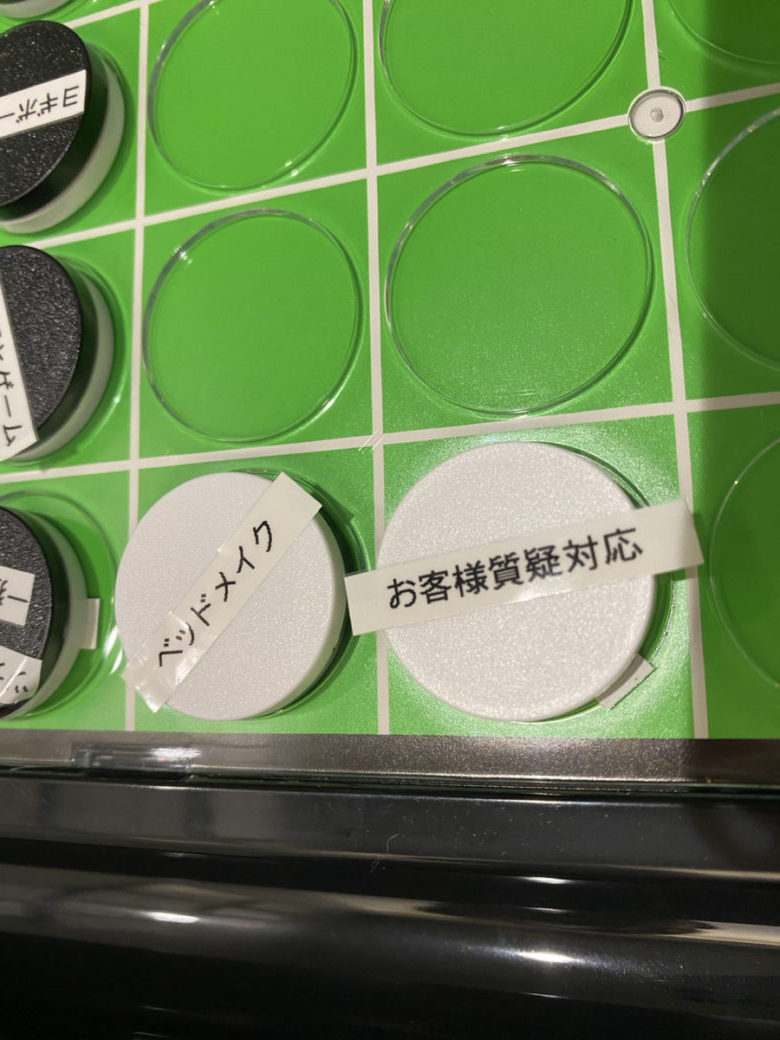 白色に業務に関するタスクをシール印刷し貼っておきました。