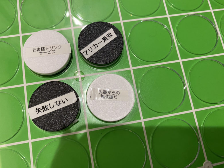 ファーストアクションとしては完璧ではないでしょうか。まさかオセロのためだけに職場に来るなんて思っていない&店長まで巻き込んでんのかい、という絶妙な表情を出す土井さん。メンタル総崩れなはずです。さっそく仕掛けていきましょう。