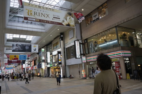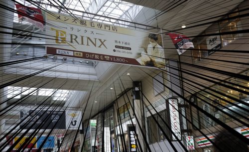 通町側から下通入ってすぐ(元パルコ前)の頭上に、天より舞い降りてきたかのような看板を発見。