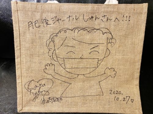 ちなみに番組の企画の流れで、エコバッグにサインと似顔絵まで書いて貰いました(どんな流れだよ、と思われた方は番組をチェック)。事務所に飾ります。