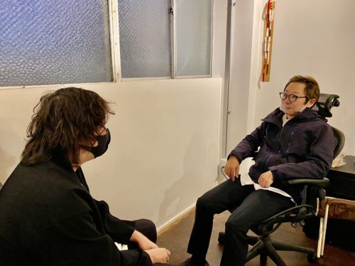 夕暮れ時の肥後ジャーナル編集部にて、神妙な面持ちで話し合う二人。