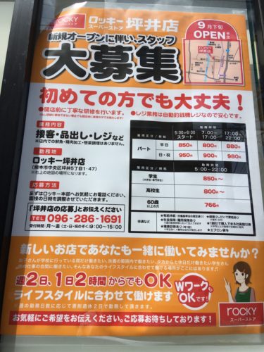 ゆめマート坪井跡に、ようやく近隣住民待望のスーパーが復活します。現金をチャージすることでお得に使えるroccaカードなども利用できるロッキー、価格もリーズナブルなので、オープンが楽しみです。
