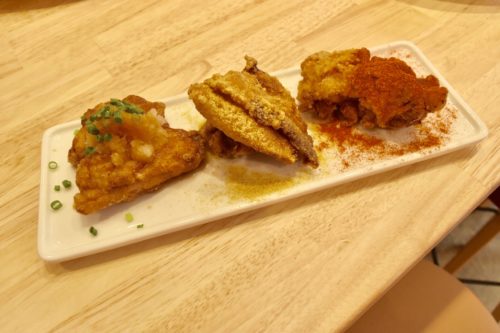 左から「ネギおろし」「カレー」「ホットチリ」。右に食べ進めるほど、味がスパイシーに変化していくのを楽しむのも良いですね。生ビールに合う鶏もも肉をビールに漬け込んで、カリッと揚げています。衣が薄いので、パリッパリ! 肉の旨味をダイレクトに感じられる!