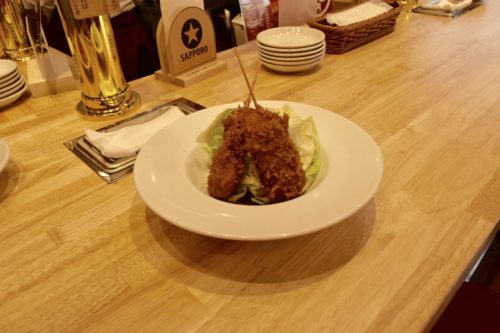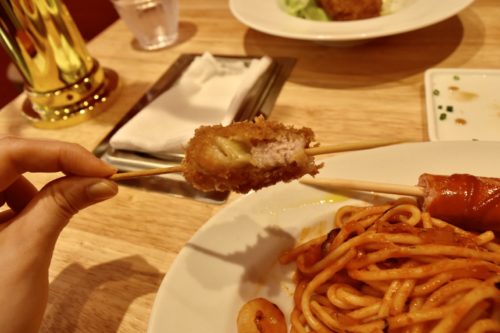 串カツには、ネギも入っています。厚みのあるお肉なので、よく噛んで食べましょう。