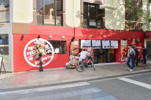 城見町通りを銀座通り方面へ進む曲がり角に、突如現れる真っ赤な外観のお店。こちらが「やみつき! 焼きスパ ローマ軒熊本下通り店」です。