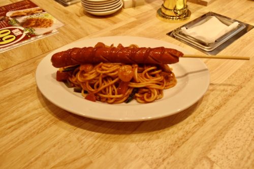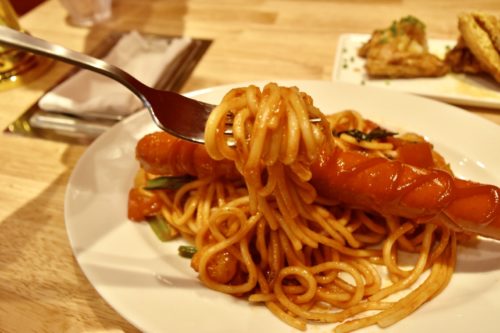 こちらがローマ軒で人気No.1の「ナポリタン」。今回は長さ30cm! ジャンボソーセージをトッピングにいただきます! 具材もゴロゴロ入っているので、食感も良い!