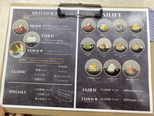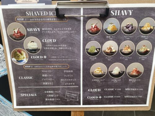 ソースを選ぶより前に「STEP1 お好みのかき氷の種類を選びましょう」とあり、「SHAVY(シェイビー)」と「CLOUD(クラウド)」という2種類とCLOUDの大盛から選べるようです。そしてこちらとは別に「大人のかき氷」という夜限定メニューがあります。