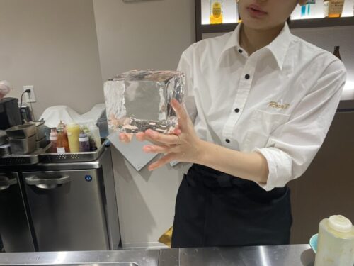 確かに実際に使用する氷と比べると中に亀裂は入っていますが、これでも充分綺麗ですよ…?!と思うのですが、お店の厳しい基準ではお出しできない氷。このような氷は練習用に使われます。