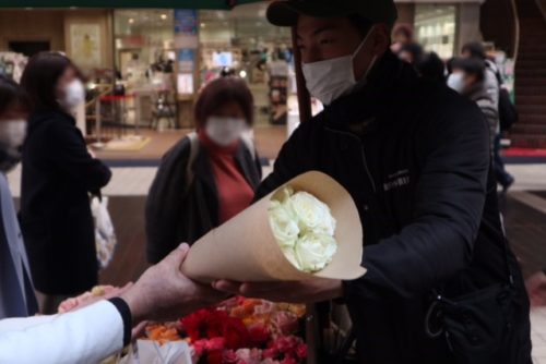 でもさらりと白の薔薇をもらうのも素敵。40代男性のお客さまは「今、妻の習い事の迎えに来て歩いて来たら、おお!綺麗なバラがある~とびっくりしたので、買いました。こんな機会もなかなかないので渡します。いいですね!」との事でした。