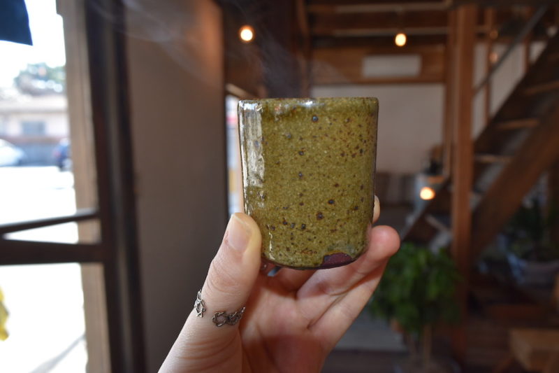 ご希望があれば試飲もできるらしく、お願いをすると湯呑みで登場! 店内で使われる食器具は、店主こだわりの逸品ばかり。見た目から美味しいのです!