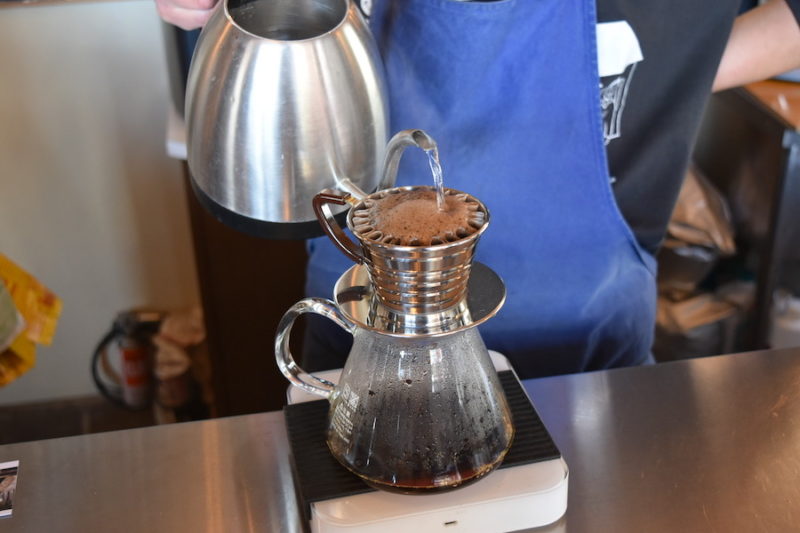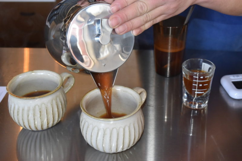 お店では、コーヒーとお湯を入れ、金属フィルターを押し沈めたら注ぐ「フレンチプレス」でコーヒーを入れていました。抽出の難易度が低く、コーヒーの油分が濾過されずに注がれるので、豆本来の味を引き出すことができるとか。