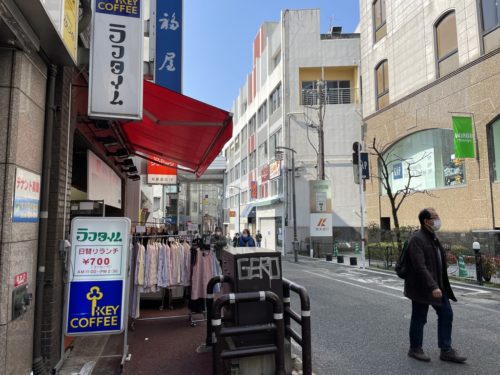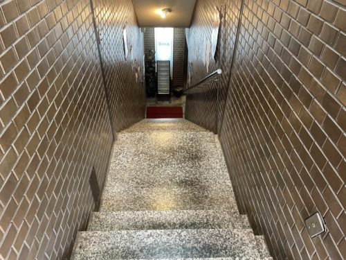TSUTAYAに向って左隣に福屋さん。その左隣に異世界への入り口のような階段があります。