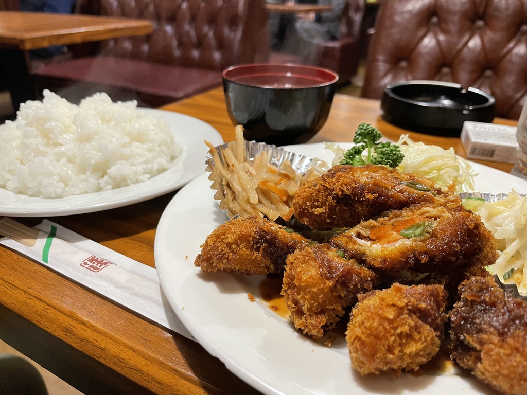 ハイ、出てきました、この日のランチは「肉巻き野菜のフライ」。ご飯の量がジョイフルのご飯大盛りより多い、お腹いっぱいになる量です。