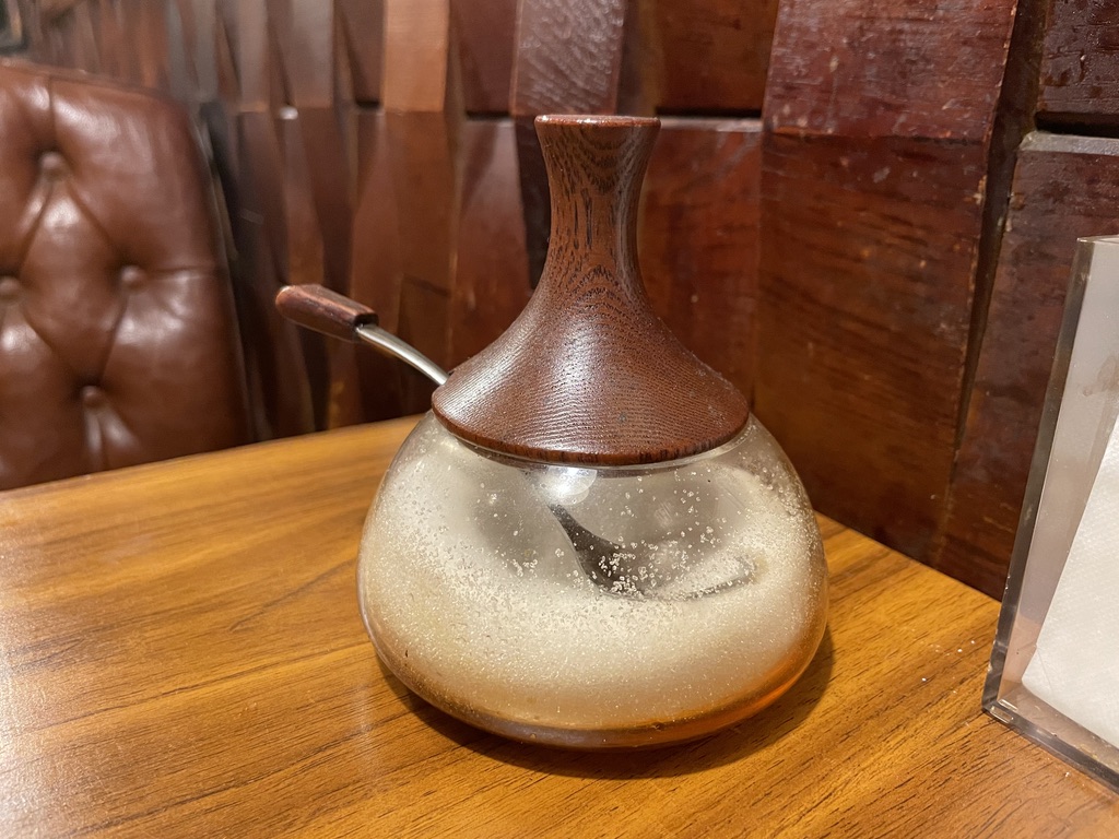 食後にはコーヒーとタバコ、やっぱ落ち着きます。砂糖が入ってる入れ物が