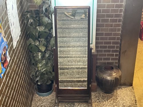 この気遣いですよ、これこれ!!!身だしなみを整えて、または服に粗相をしてないかをチェック。(姿見の横にも壺が!)