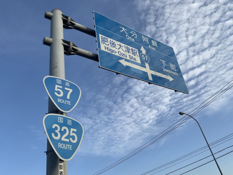 大津で、国道325号と合流します。57号は阿蘇・大分方面で、325号は南阿蘇方面に進む道路です。