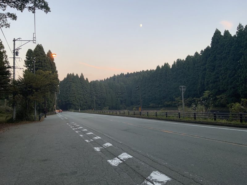 外輪山がもう赤く染まりつつあります。これ、急がないと県境についたとき真っ暗です。寄り道せずに進んでいきましょう!