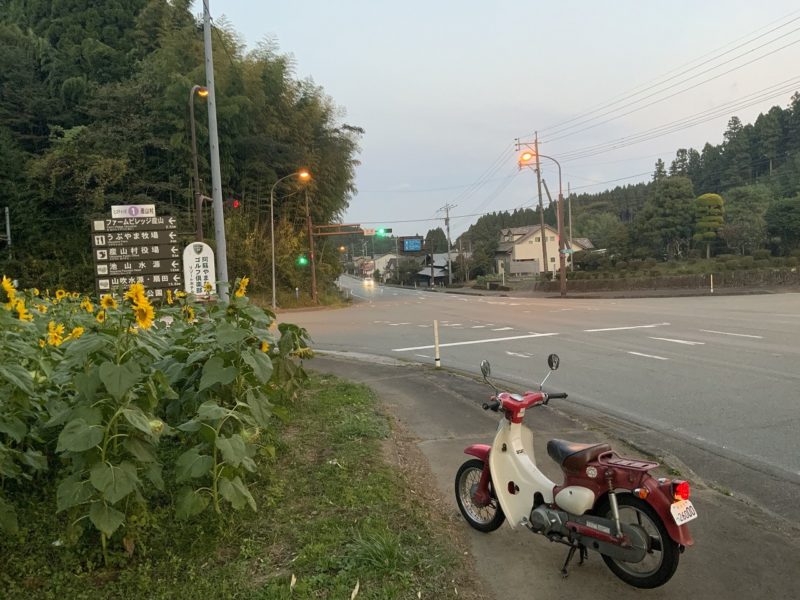 もうかなり寒くなってきているのに、ひまわりが咲き誇っていました。左に曲がると産山村です。