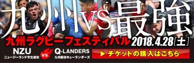 そのラグビーW杯を一年後に控え、今年は日本でも様々な地域でラグビー関連の国際親善試合やイベントなどが予定されていますが、熊本でも、4月28日(土)に、「県民総合運動公園陸上競技場(えがお健康スタジアム)」にて、あのラグビー強豪国「ニュージーランド」の期待の若手学生選抜代表チームNZUが、九州代表選抜のチームQ-LANDERSと親善試合を行うようです。