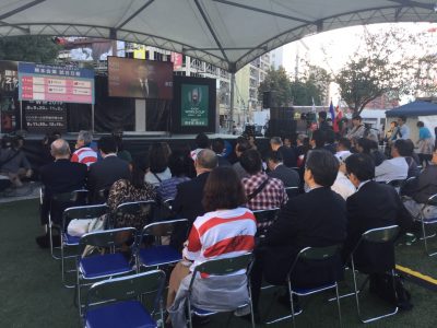 全国の開催としで、パブリックビューイングによる発表会の生中継が行われ、熊本では花畑広場に大型のスクリーンが登場。多くの来場者が試合日程の発表を見守りました。