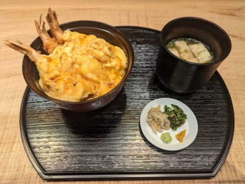 大きなエビフライが3尾、ふわふわの絶妙なとろけ具合の卵でとじられたエビとじ丼で、エビフライのザクザク感とトロトロの卵。