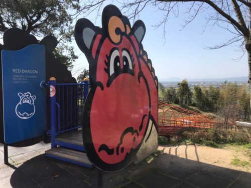 駐車場のそばには、野外ステージを備えたお祭り広場があり、丘の上には、グリーンドラゴンとレッドドラゴンの二頭の竜がいますよ。