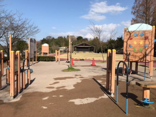 お祭り広場の横には、遊びながら体を伸ばしたりできる健康器具もたくさんあるので、大人の方のリフレッシュや運動にも、うってつけです。