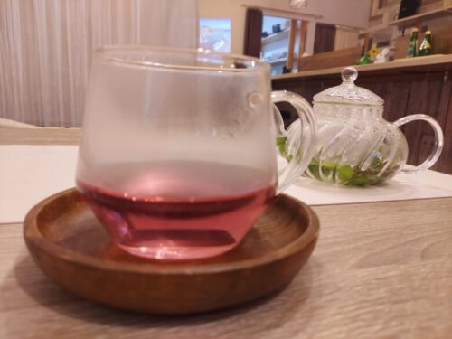 赤いハーブティーには、ハイビスカスローゼルというハーブが使用されており、青色に比べて酸味が強いハーブティーでした。