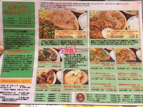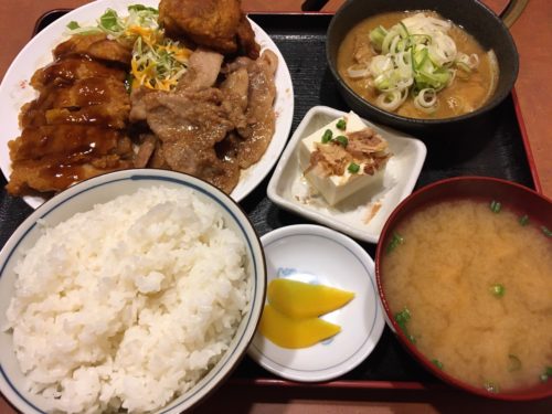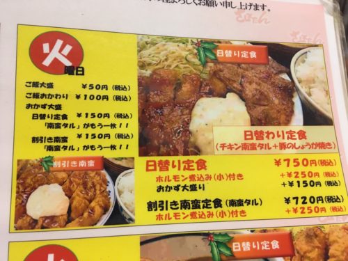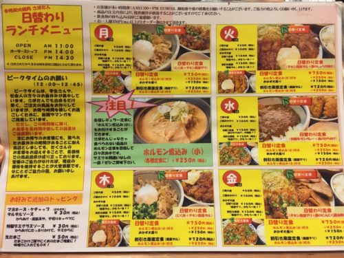 火曜日の日替わりは、チキン南蛮タル+豚のしょうが焼き(税込750円)。それに+250円でホルモン煮込みを追加したものがこちら!