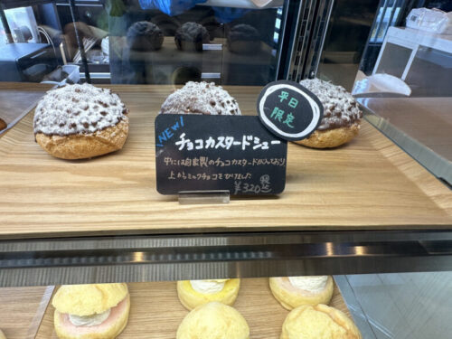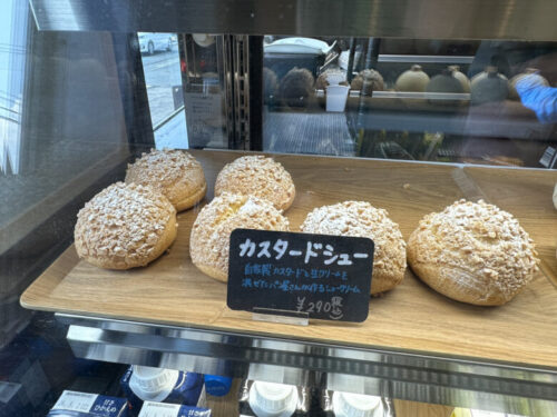 ショーケースに並ぶカスタードシューやパン達。