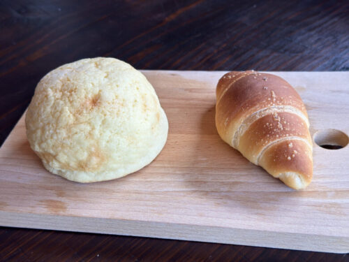 まずは、外はカリカリ中はしっとりの大きめメロンパンともっちり感と塩加減がちょうどよい塩バターロール。