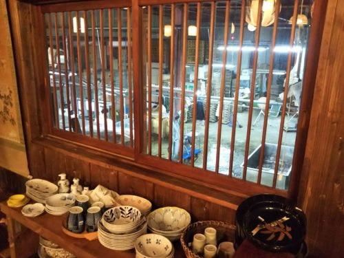 「茶房さくらさくら」の店内からは、古式醸造蔵がある工場を見学することができます。この併設工場で味噌をつくっているそうです。